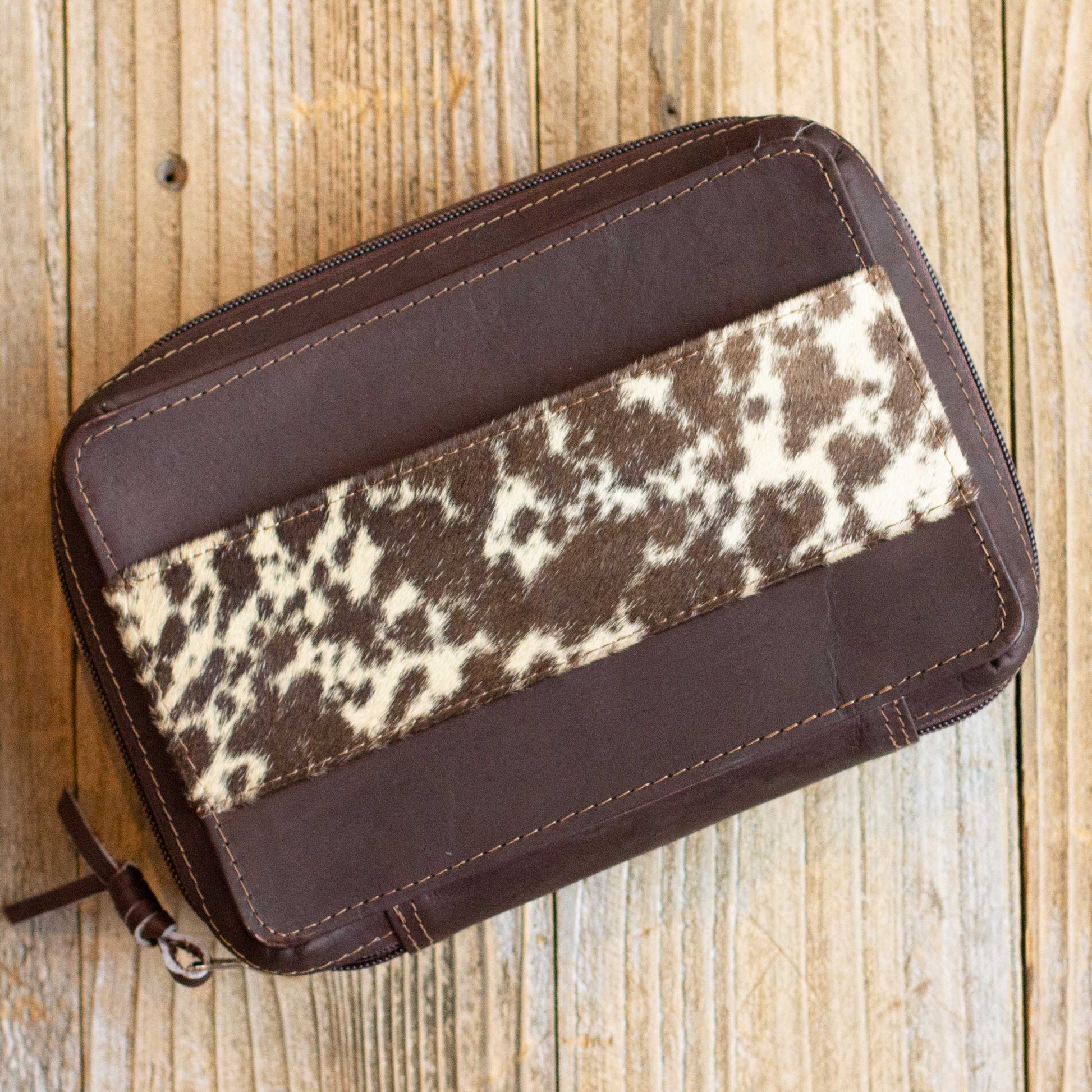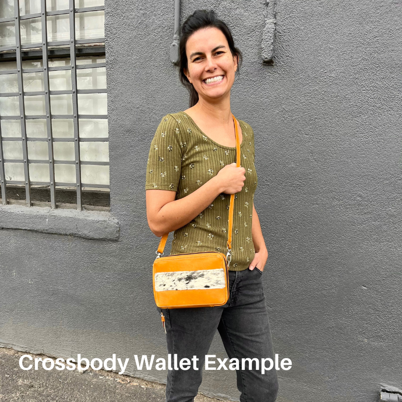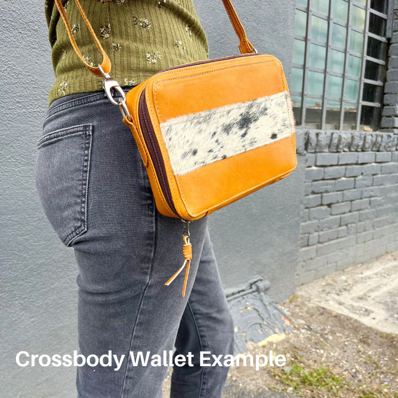 Crafted from high-quality leather with a striking cowhide accent on the front, the Crossbody Wallet offers a unique blend of modern design and timeless craftsmanship. Choose from four beautiful cowhide styles to match your personal taste. The wide YKK zipper opens ¾ of the way around the bag, making it easy to access everything inside.