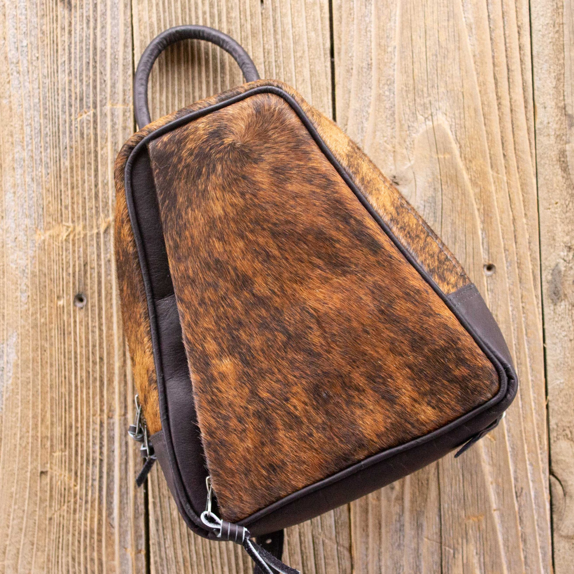 - Cowhide front and sides with leather accents on the back, bottom, top handle, and shoulder straps