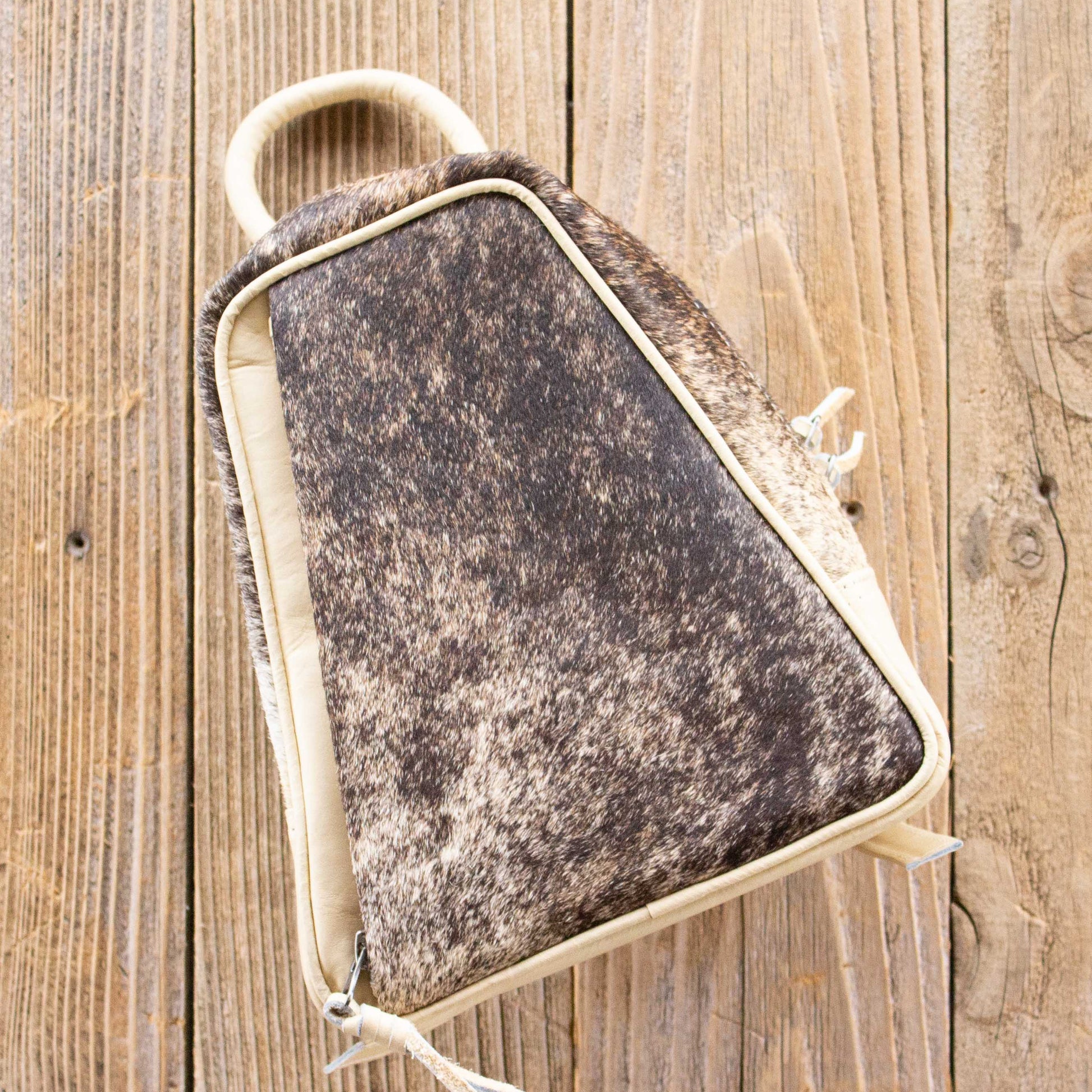 - Cowhide front and sides with leather accents on the back, bottom, top handle, and shoulder straps
