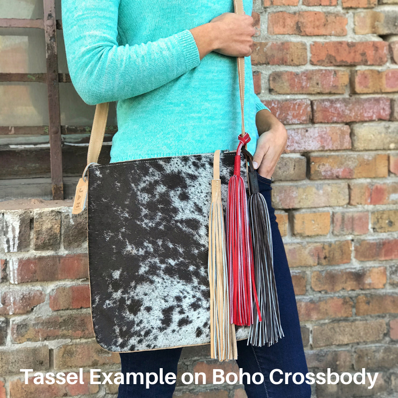 A teal leather Tassel that will enhance the personality of any bag. Designed to loop onto almost any strap or handle. Tassel is approximately 12" long.