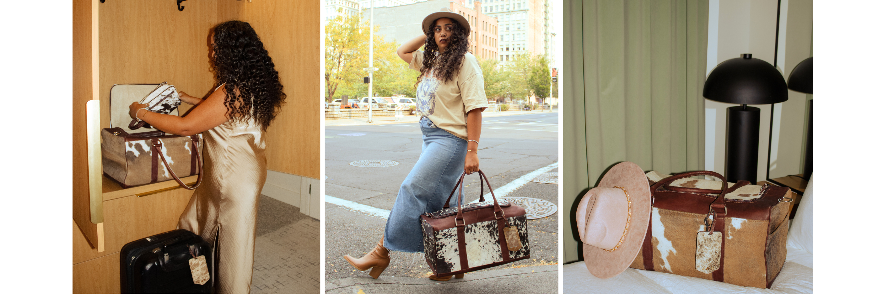 š One of a kind cowhide panels paired with leather trim for a look that turns heads everywhere.