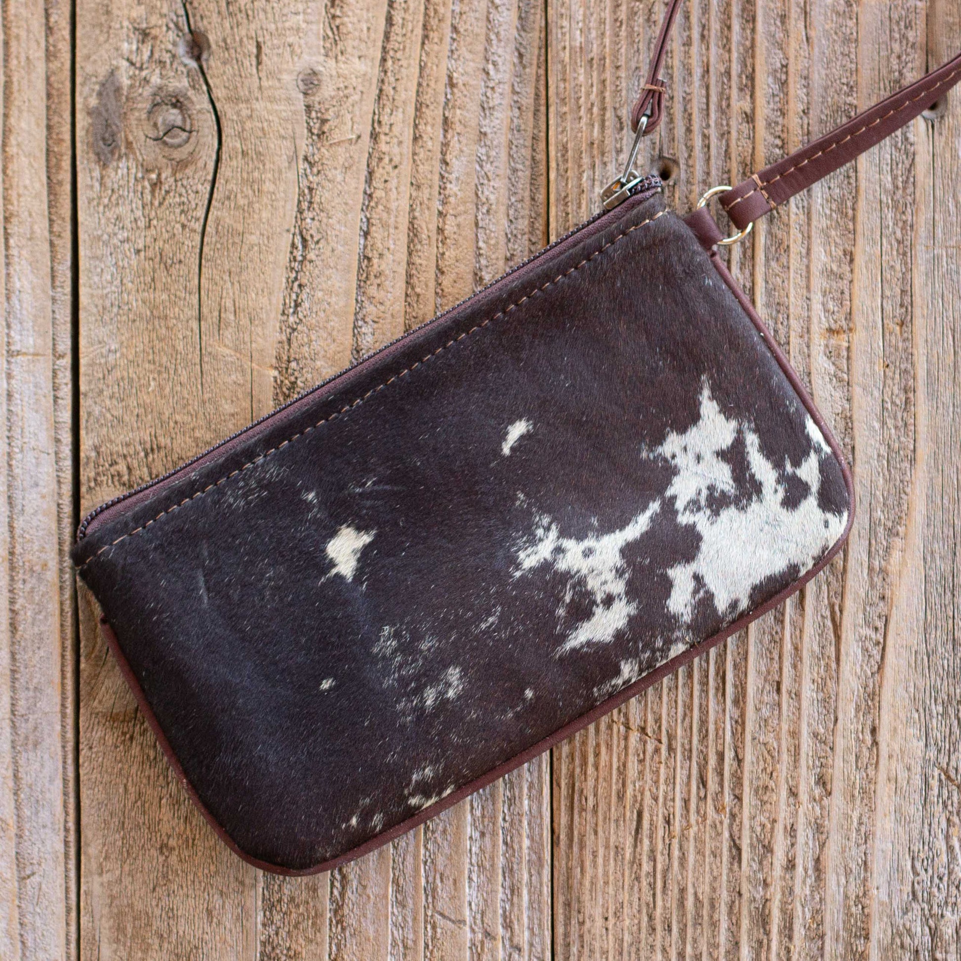 🤠 Stadium-approved Wristlet design with one of a kind cowhide character.Â